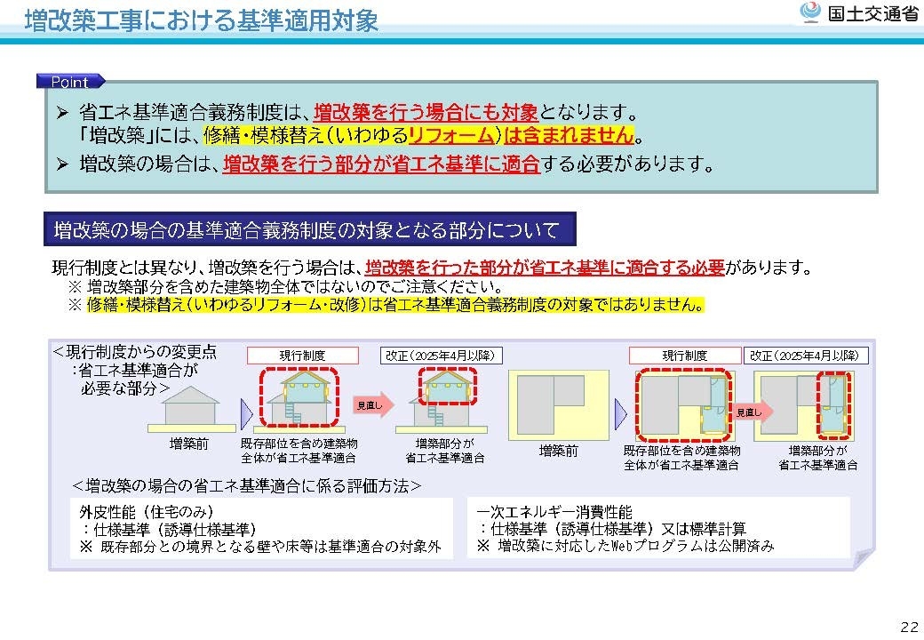 増改築の場合は、増築・改築を行った部分が省エネ基準に適合する必要があります(既存部位を含めた建築物全体ではない)。また、増改築には建築基準法上の修繕・模様替え(いわゆるリフォーム・改修)は含まれません。