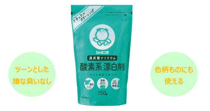 「シャボン玉酸素系漂白剤」は成分の過炭酸ナトリウムが水に溶けることで酸素が発生し、その酸素の発泡力で汚れを落とします。水に溶けやすく高い洗浄力があります。