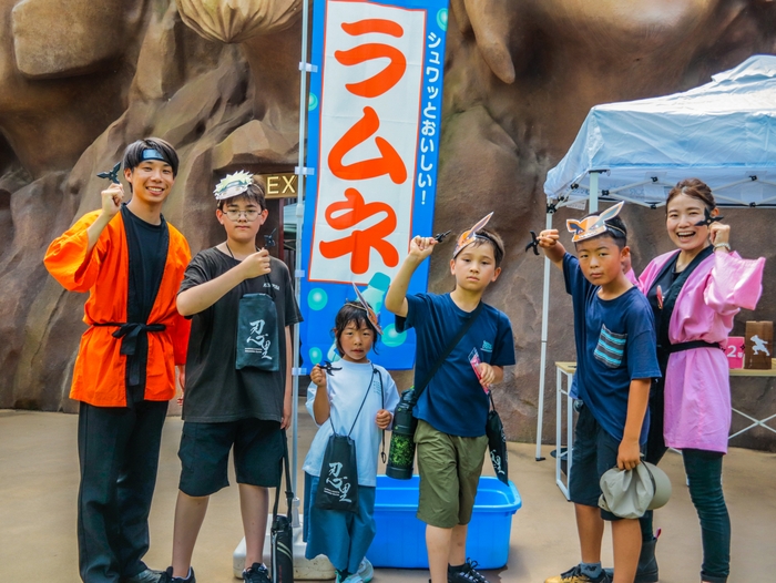 射的のように3つの手裏剣を的に向かって投げ、倒した的の色に応じて、オリジナルグッズをプレゼント。