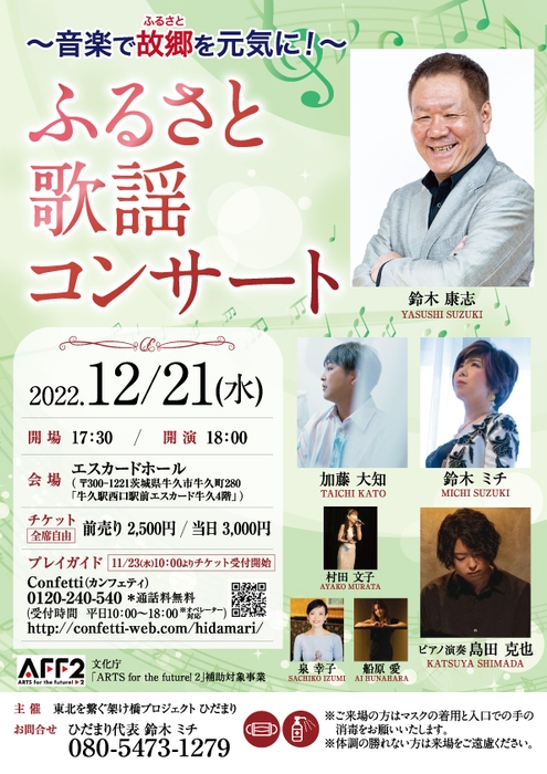 東北を繋ぐ架け橋プロジェクト ひだまり(代表:鈴木ミチ)主催、~音楽で故郷を元気に!〜『ふるさと歌謡コンサート』が下記の通り3会場で開催されます。