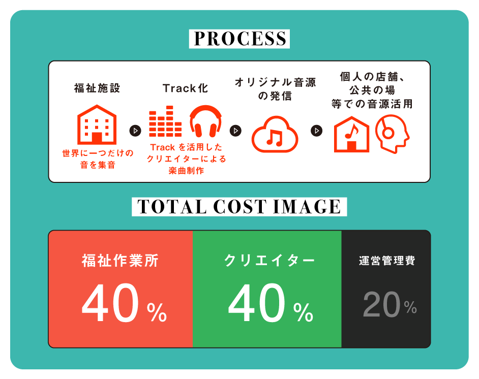 楽曲配信によって得た収益は、福祉施設やアーティストとシェアし、関係性や価値観を育むとともに、新たなビジネスモデルの構築も目指しています。