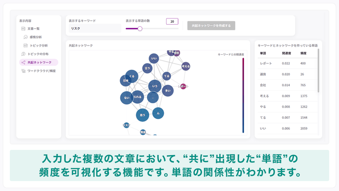 入力した複数の文章において「共」に出現する単語を表示します。また、その出現頻度を円の大きさで可視化することができます。単語の関係性から、文章の特徴を把握することが可能です。
