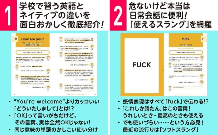 日本人とネイティブが話す英語の違いから、日本人がマイナスなイメージを持つ「スラング」の正しい使い方までを網羅。もちろん、動画のコミカルな面白さはそのままに、海外に行ってもすぐ使える日常英語が満載です。