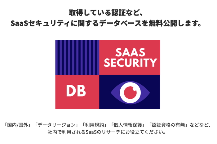 各SaaSの取得認証、利用規約などの情報を一覧できるデータベースを無料公開します。利用中サービスの情報を確認したり、導入予定のSaaSをリサーチしたりする際に役立ちます。