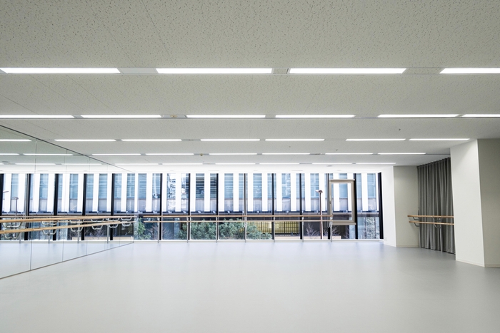 大きく外へと開かれた窓からは、やわらかく心地よい光がスタジオ内にあふれ、広く解放感のあるスタジオが誕生しました。床は、既存のスタジオと同じく足に優しい構造はそのままに、Kバレエ スクールとしては初となるリノリウムを採用。内装は都会的な印象を与えるグレーとあたたかい木調を組み合わせた色調で、スタイリッシュな雰囲気に仕上げました。施設は大小2つのスタジオとロッカールームを備えています。