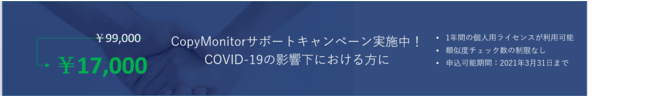 CopyMonitorでは現在すべての方向けに2週間の無料体験キャンペーンと個人向けライセンスのプロモーションを実施しております。CopyMonitor社に連絡をすることで無料体験期間の延長もすることができ、他社の製品を使っている教育機関や研究機関においてもまずは無料でCopyMonitorを体験してもらう取り組みをしています。是非この機会にCopyMonitorを使用してみてください。