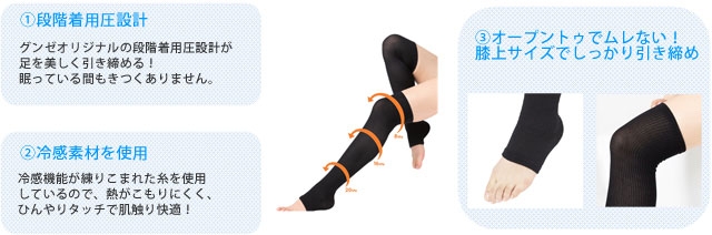 本商品は足首から太ももにかけて段階着圧設計をした商品で、はいて寝ると翌朝スッキリ美脚で心地良い着圧感のソックスです。また冷感機能のある糸を使用しているので、ひんやりタッチで夏でも快適に過ごせます。さらにオープントゥなのでムレにくく、着用しながらネイルケアも出来ます。