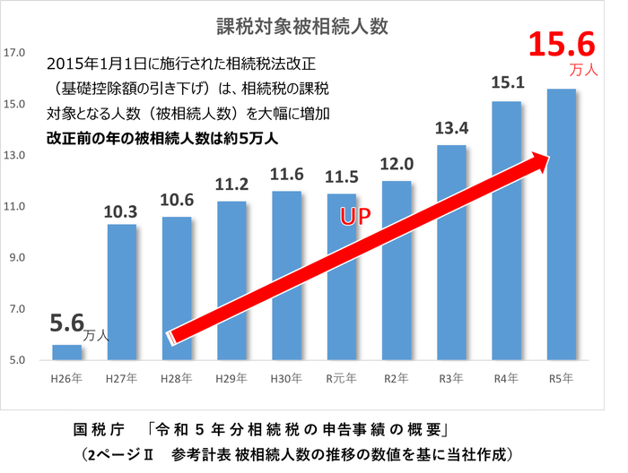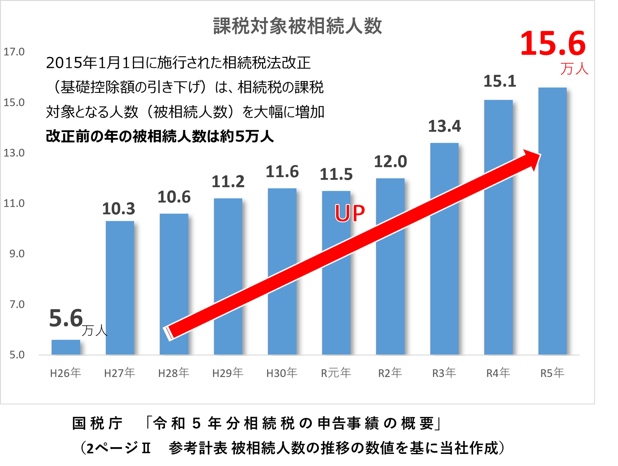 相続税の申告書提出に係る被相続人の数(相続税の課税対象となった故人の数)は増加傾向にあり、2015年まで5万人前後だったものが、2023年には15.6万人となっています。