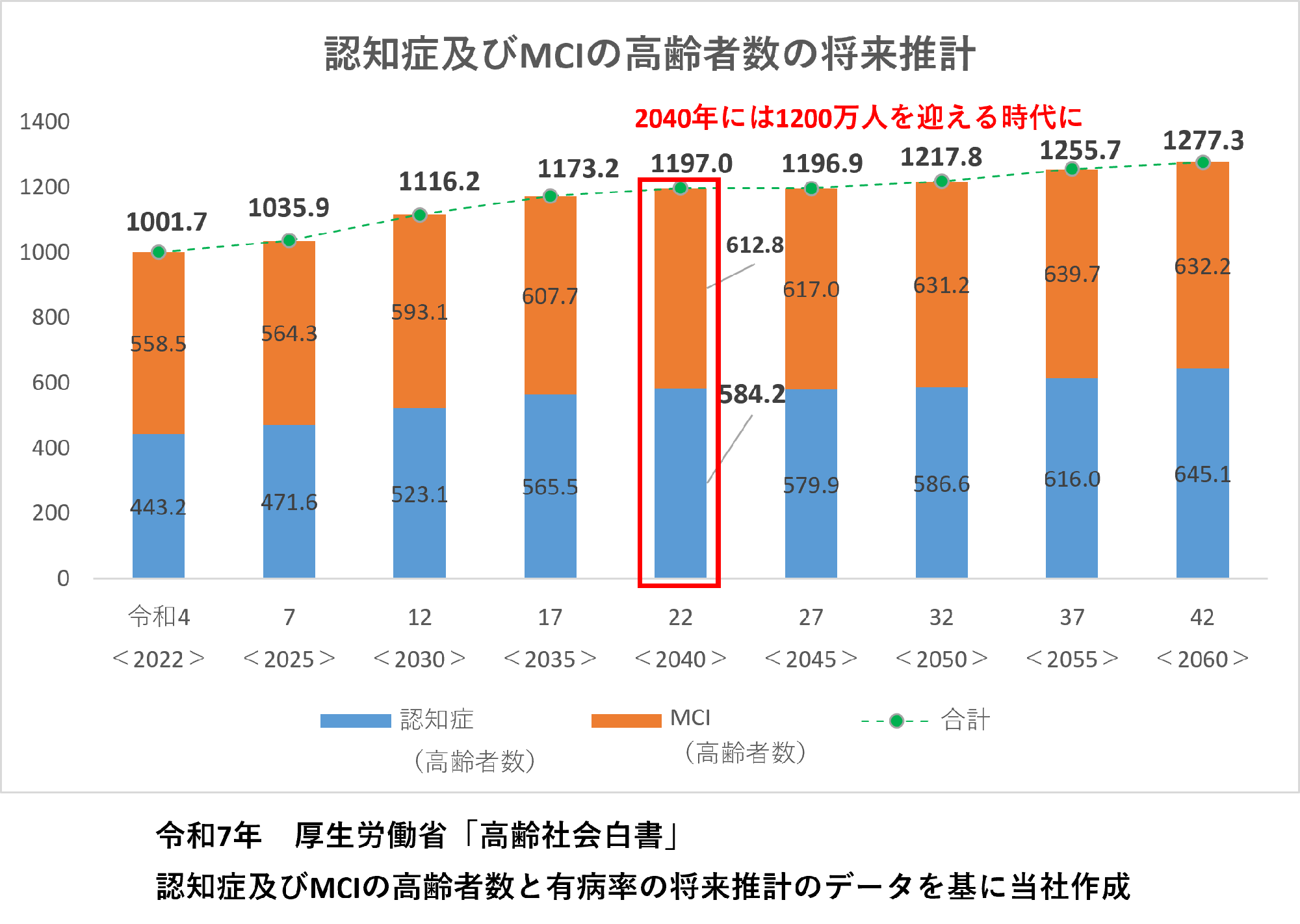 さらに、軽度認知障害(MCI)の高齢者も含めた認知症またはその予備群の総数は、2040年には約1,200万人に膨れ上がり、高齢者の約3.3人に1人が認知症又はその予備群となる時代が到来*します。