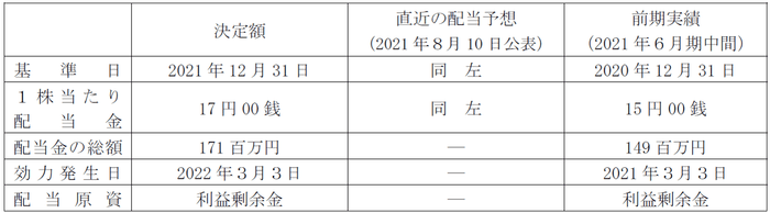 サンネクスタグループ株式会社(東京都新宿区:代表取締役社長 髙木 章:証券コード 8945)は、2022 年2月7日開催の取締役会において、下記のとおり、2021 年12 月31 日を基準日とする剰余金の配当(中間配当)を行うことを決議いたしましたのでお知らせいたします。