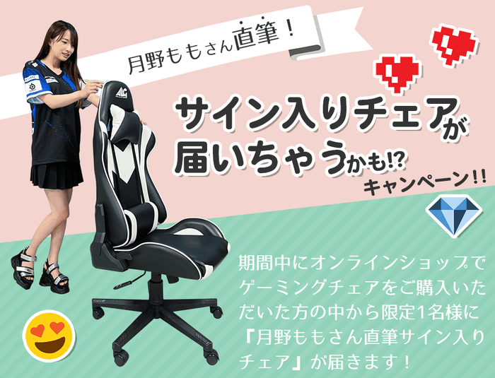 期間中にオンラインショップにて、ゲーミングチェアを購入いただいた方の中から限定で1名様に、月野ももさんの直筆サイン入りチェアが届きます。