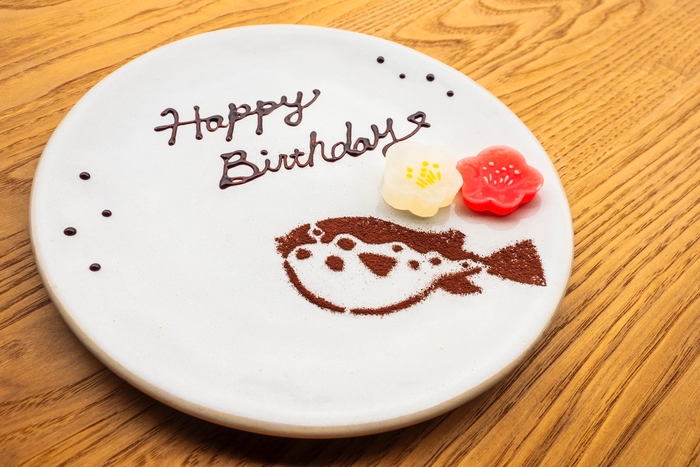 お魚をあしらったメッセージプレートと、福井梅を使ったスペシャルドリンクに加え、ご希望に応じてアニバーサリーケーキとブーケをご用意します。