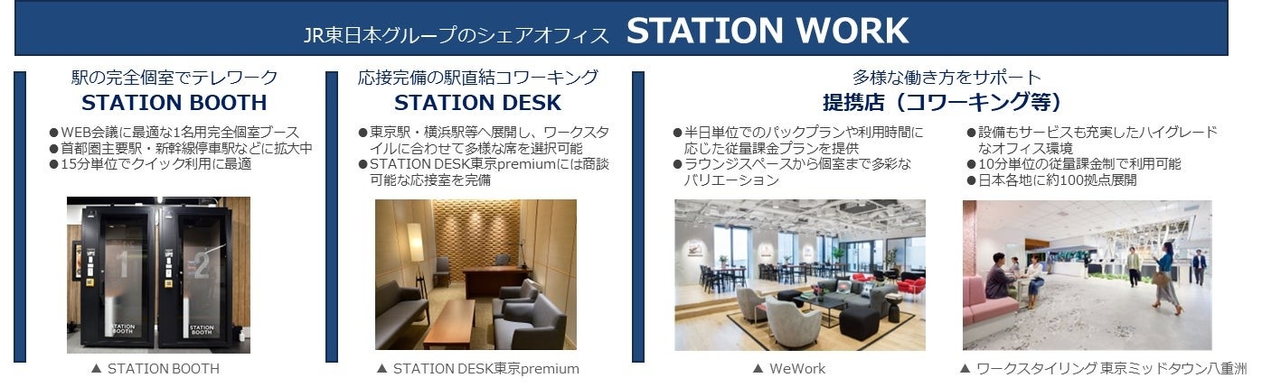 2019年8月に開業したJR東日本グループのシェアオフィス STATION WORK は、「働く人の“1秒”を大切に」を事業コンセプトに多様な働き方をサポートしています。今回の提携により、全国約1,250カ所のネットワークとなります。駅の便利なワーキングブースSTATION BOOTHはもちろん、コワーキング等をはじめとするワークプレイスを提供することで、多様化する働き方をサポートし、ソリューションを提案していきます。