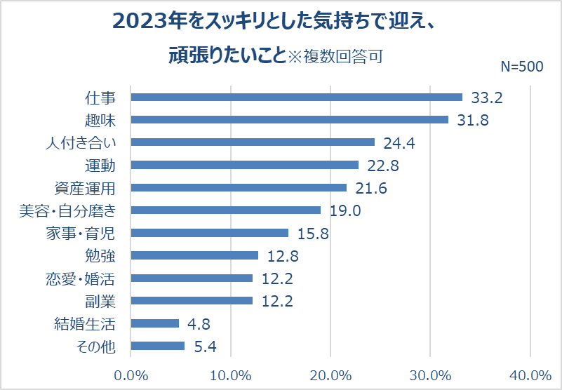 今抱えていることをスッキリさせて2023年を迎えたい人がいることが分かりました。2023年に頑張りたいことを聞いた結果、3割以上が「仕事(33.2%)」、「趣味(31.8%)」と回答しました。仕事もプライベートも充実させたいと考えている人が多いことがうかがえます。