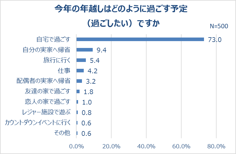 今年の年越しはどのように過ごす予定か(過ごしたいか)聞いたところ、7割以上の人が「自宅で過ごす(73.0%)」ことが分かりました。「自分の実家へ帰省(9.4%)」する人は約1割に留まる結果となりました。「旅行に行く(5.4%)」人もわずかながらいるようです。