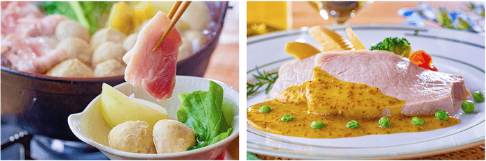 左:宮城県生まれの銘柄豚「宮城野豚(ミヤギノポーク)」を使ったローストポーク。ゆっくりと火入れした、しっとりとした肉質をお楽しみください。