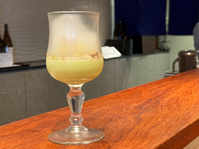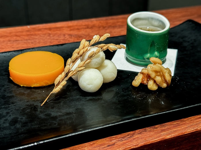 今月の先付は、霧が出始める季節に見立て、スモークの演出を楽しめる一品をご用意しております。前菜は、月見団子に見立てた百合根団子と満月に見立てた南瓜。共に十五夜をイメージしており、季節ごとの食材を使用することで、同会席料理を飽きることなく、お楽しみいただけます。