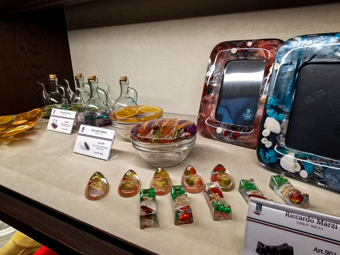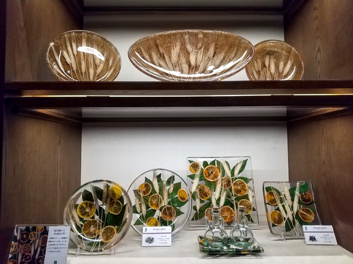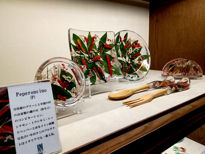 透明の樹脂に閉じ込められた天然の果実や植物が遠くトスカーナの風景を映し出します。