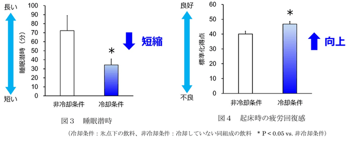 その結果、就床30分前に内部冷却を行うことで、睡眠潜時(寝つくまでに要した時間)が有意に短縮されること(図3)、さらに、起床時の疲労回復感を表す主観的評価項目が有意に改善すること(図4)が明らかとなりました。