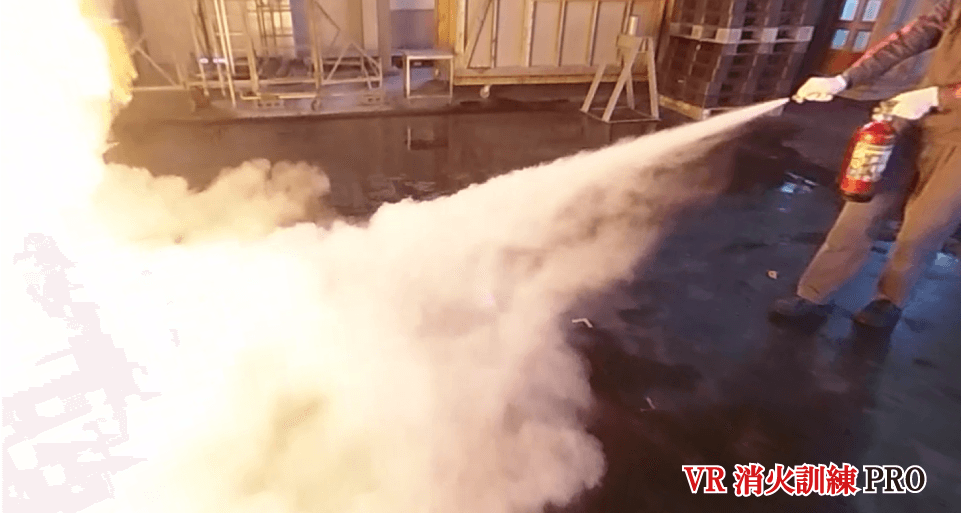 さらに往来の消火訓練で使用されていた水消火器とは異なり、VR内では、消火薬剤が舞い、火の元が狙いにくくなるという現象も再現しており、実践に近い体験がVRでは可能です。