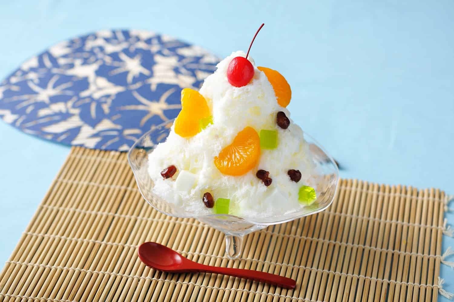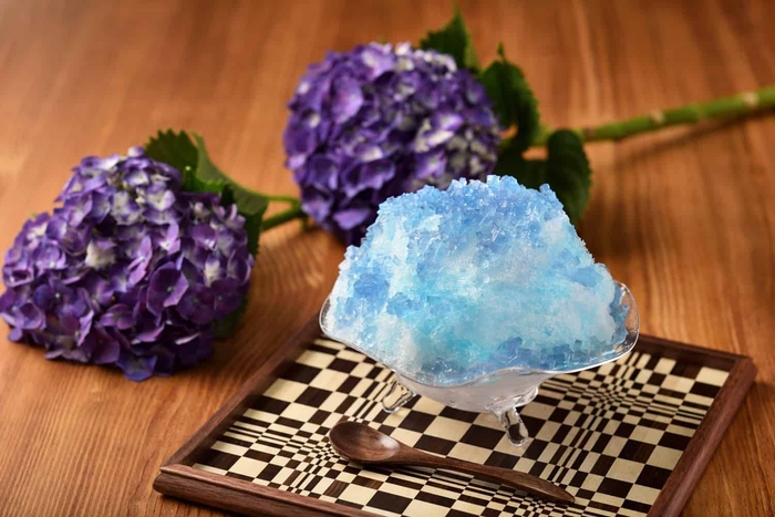 箱根エリアは標高差があるため、長い期間にわたってあじさいを楽しめます。開花の時期、箱根登山電車は「あじさい電車」とも称されています。青い花が集まって咲くその姿はとても爽やかです。その色味をゼリーやシロップで表現したかき氷です。