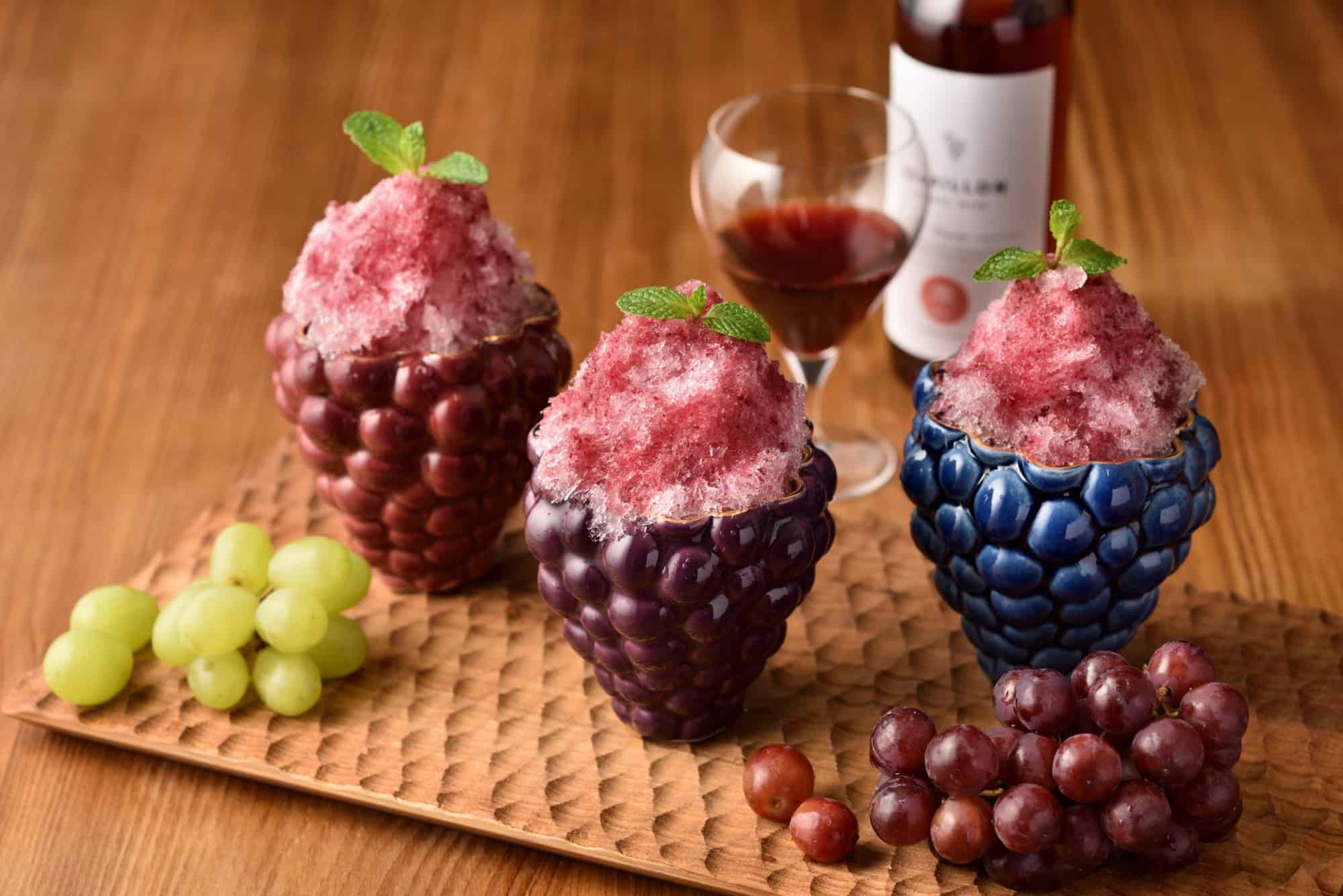 松本市に隣接する塩尻の桔梗ヶ原地域は長野ワインの先進地として知られています(*7)。界 松本では約50種類の桔梗ヶ原ワインを揃えています。かき氷にはその中から、フルーティーな「コンコード種」ワインのシロップを使います。