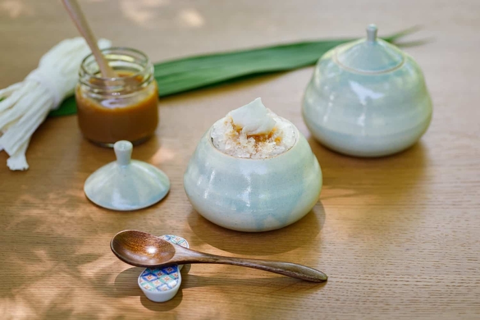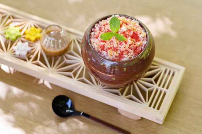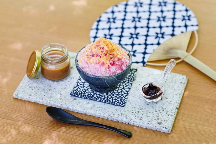 栃木県が国内生産量の98%を誇る「かんぴょう」は、ウリ科の植物である夕顔の実を薄く剥いて干した作物です(*6)。界 川治ではその夕顔の形を模した器にふわふわの氷とかんぴょうのシロップ煮を盛り付け、ミルクジャムをひとさじかけて仕上げます。やさしい甘さに癒される一品です。