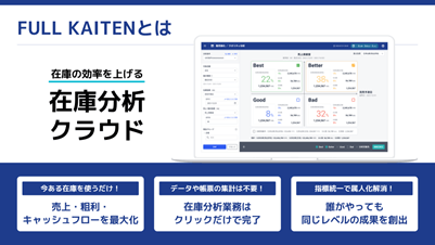 FULL KAITENは、在庫効率を向上させるための在庫分析機能をクラウドサービスとして提供しています。これまで提供してきた「プロパー消化率を向上させる、不要な値引きを抑制する、客単価を向上させる、売れ筋商品の追加発注数量を計算する」などの機能は、どれも在庫効率を向上させ売上・粗利・キャッシュフローを増加させるのに有効です(下図)。