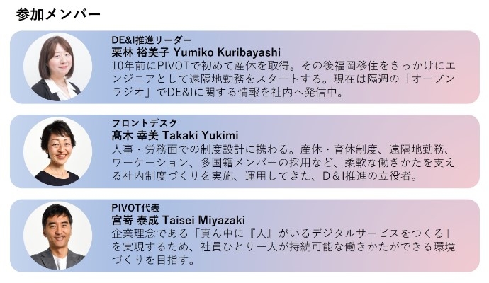PIVOTがD&Iについて取り組むきっかけや、取り組みの具体的な内容、活動に対する思いなどを存分に語らせていただいております。ぜひご覧くださいませ。
