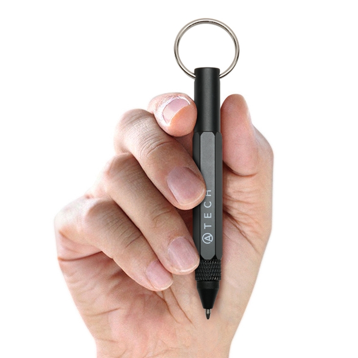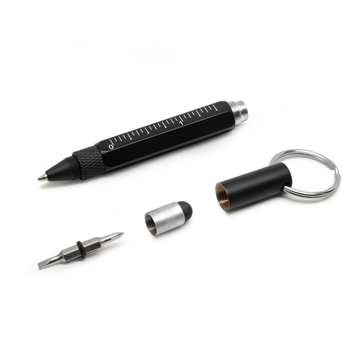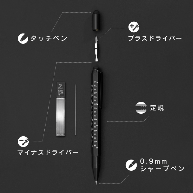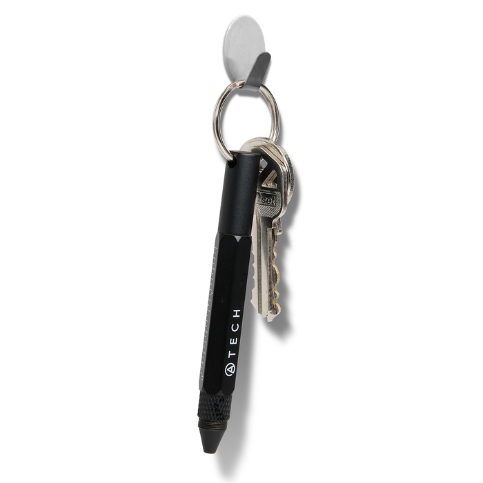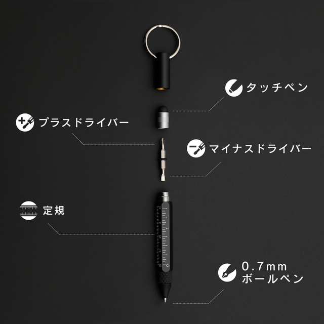 タッチペン、プラスドライバー、マイナスドライバー、定規、ボールペンを備えたコンパクトなマルチツールペン。ペンの上部にはキーホルダーがついているので、鍵やバッグなど手持ちのアイテムにかけて一緒に持ち歩くことができます。タッチペンはATM画面や店舗のタブレット端末などを非接触で操作したいときにも役立ちます。