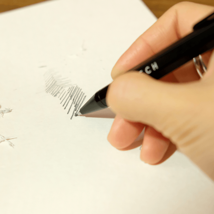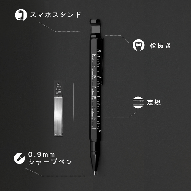 すでに販売されているマルチツールペンは、ボールペンが多くペンシルタイプはほとんどありませんでした。中学高校時代は0.5mmのシャーペンを使っていたかと思いますが、大人になってからはそこまで細いペンは実は必要なく、0.9mmの芯を採用しておりどちらかというと鉛筆の描き心地に近くアイデアやイラストを描いたりするのに良いと考えております。
