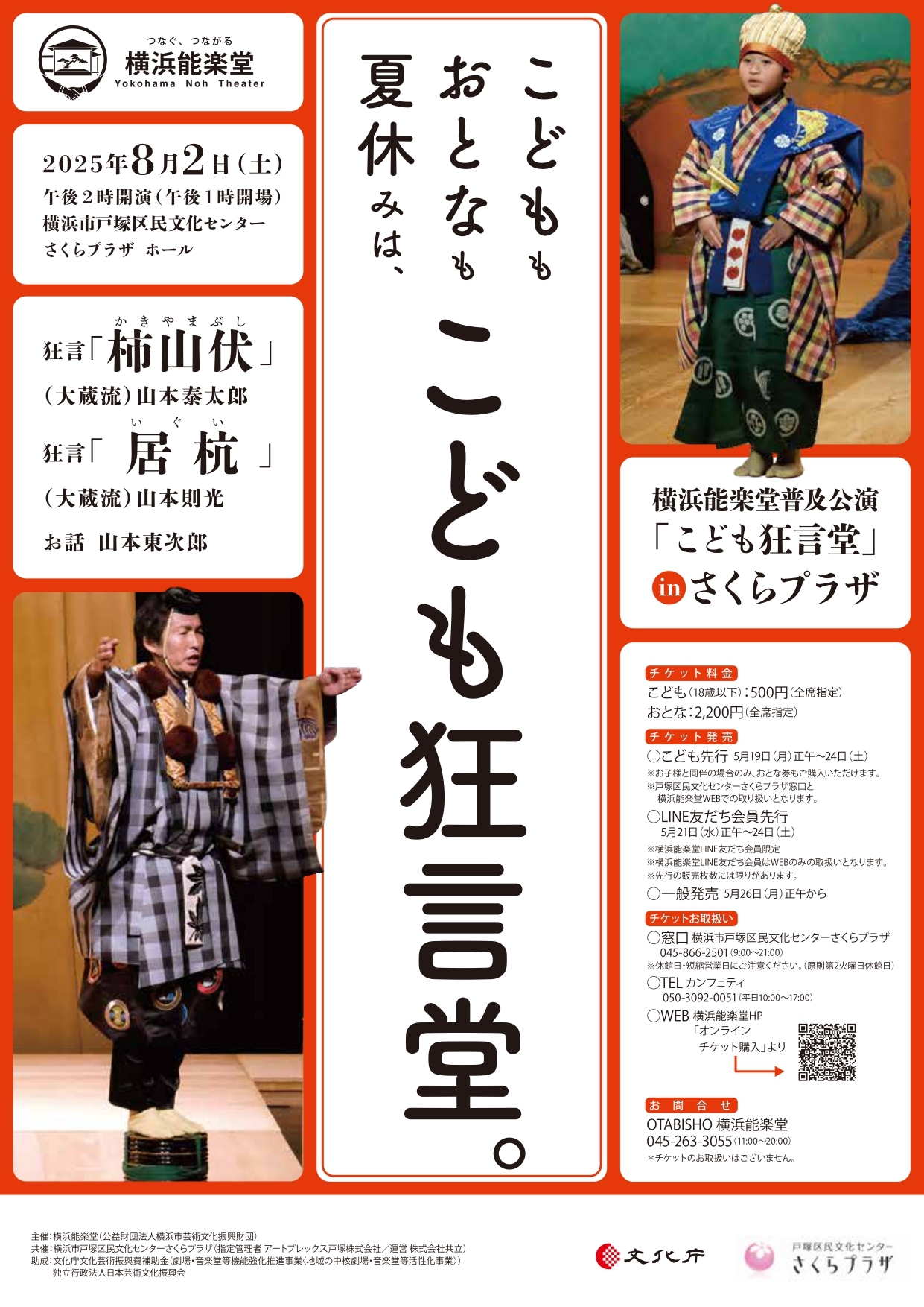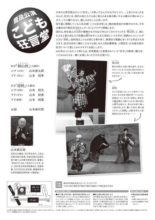 毎年夏に開催している人気企画「こども狂言堂」を、横浜能楽堂が休館中のため、今年は横浜市戸塚区民文化センターさくらプラザで開催します。