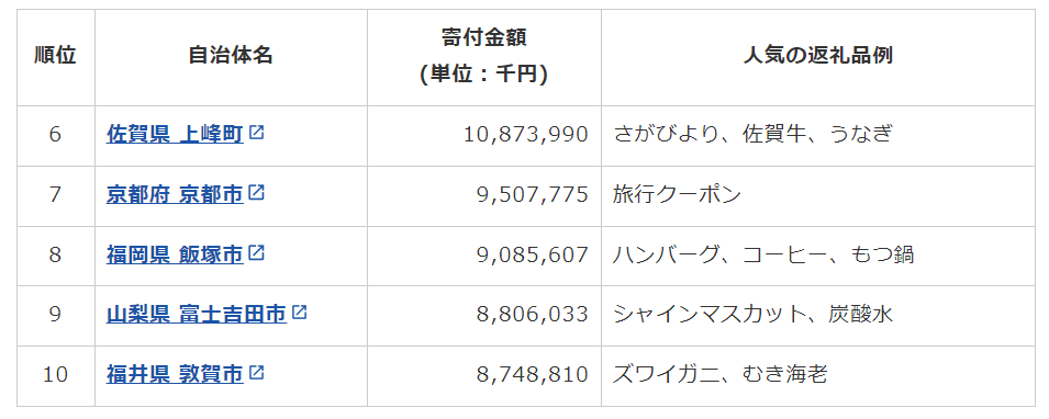 ▼ふるさと納税人気の自治体6位~10位