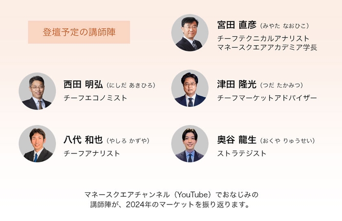 当日は、当社公式YouTubeチャンネル「マネースクエアチャンネル」でおなじみの講師陣たちが、2024年のマーケットを振返ります。この機会にぜひ一度ご視聴ください。