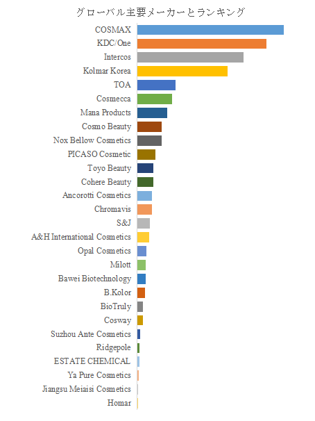 世界の化粧品OEM・ODM市場を牽引する主な企業には、COSMAX、KDC/One、Intercos、Kolmar Korea、TOA、Cosmecca、Cosmo Beauty、Mana Products、Nox Bellow Cosmetics、PICASO Cosmeticなどがある。YHResearchによると、2024年時点で上位10社が世界売上の約22%を占めており、高い集中度を示している。これらの企業は単なる製造拠点ではなく、研究開発・処方提案・ブランド共創において突出した競争力を有する。韓国のKolmar KoreaやCOSMAXは、K-Beautyトレンドを牽引するイノベーションハブとして機能し、欧米市場でも顧客基盤を拡大している。イタリアのIntercosは高級ブランド向け処方の強みを生かし、グローバル市場で安定した地位を築いている。こうしたプレイヤー間の競争は「技術・創意・信頼」を軸に展開されており、業界全体の高度化を促している。