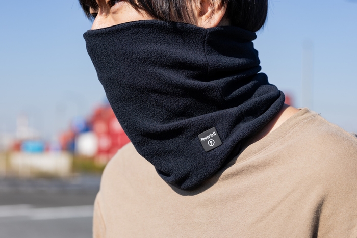 体を効率的に温められる首の前後に、柔らかく温度ムラの少ないカーボンナノチューブヒーターを搭載した電熱ネックウォーマー。