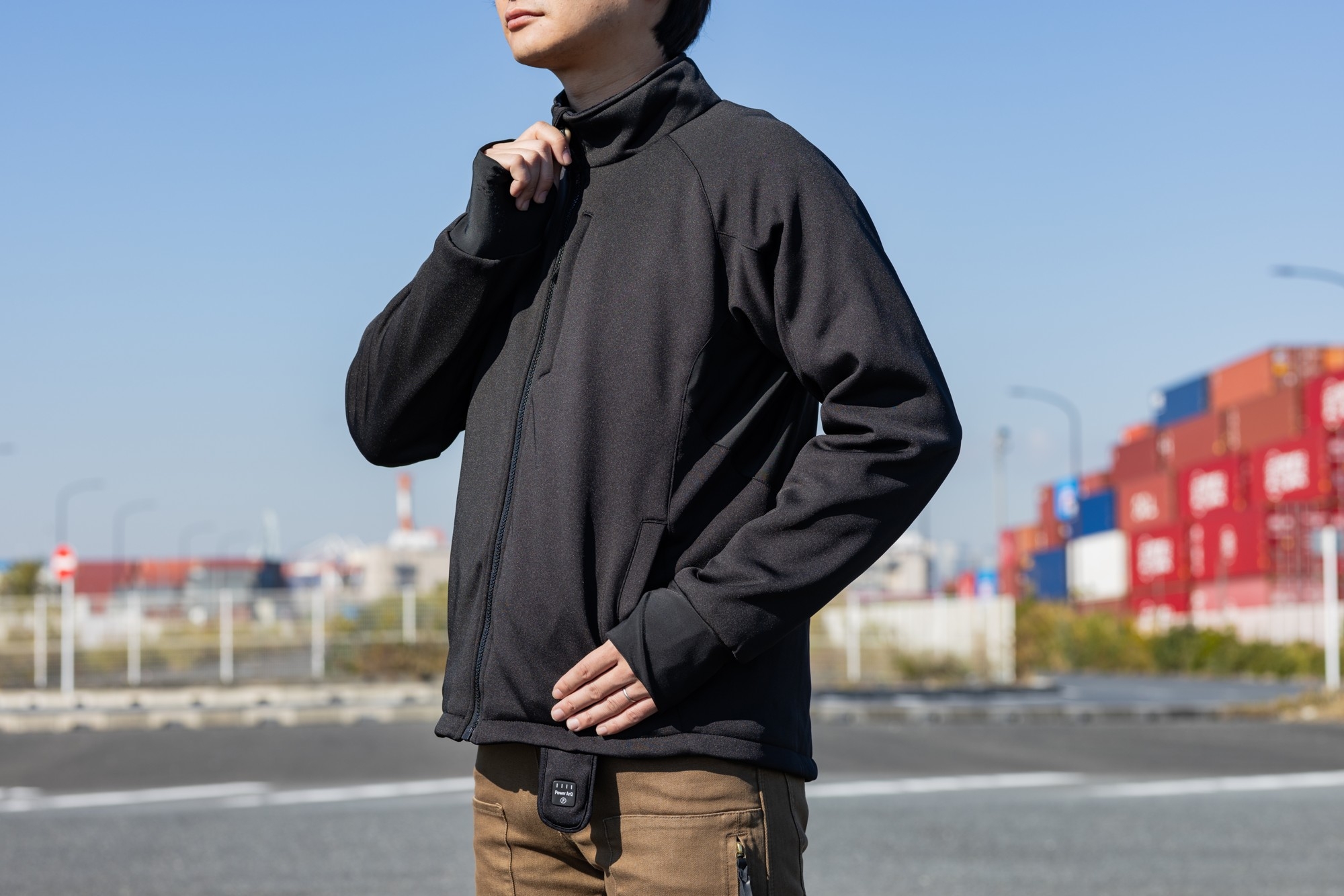 走行風を受けて冷えやすい身体の前面・背面、二の腕の前側にヒーターを搭載した電熱インナージャケット。ライディング時の動きを妨げないフィット感を追求し、背面の一部にはストレッチ素材を配置。内側にはメッシュ素材を採用し、親指ホールも備えています。