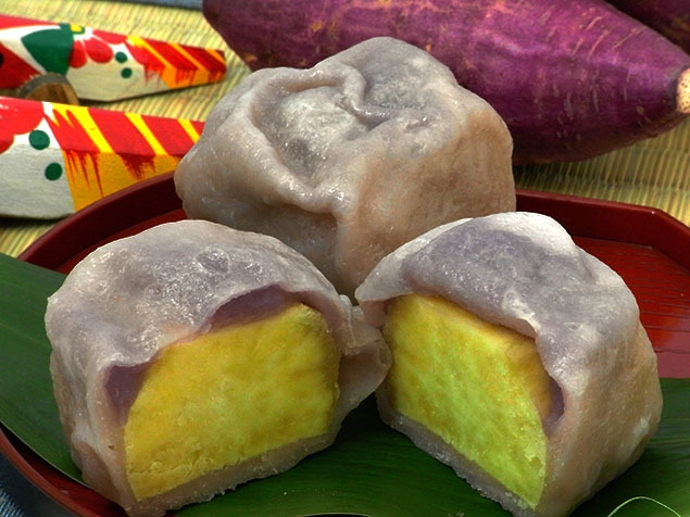 紫いきなり団子とは熊本県産のさつまいもの芯の部分だけ使用し、一口目の食べごたえを重視するプレーンタイプのいきなり団子の特徴はそのままに、生地と白あんに紫芋パウダーを練り込み色鮮やかに仕上げました。白あんを使用しているため、通常のいきなり団子にくらべあっさりとした味わいが特徴です。
