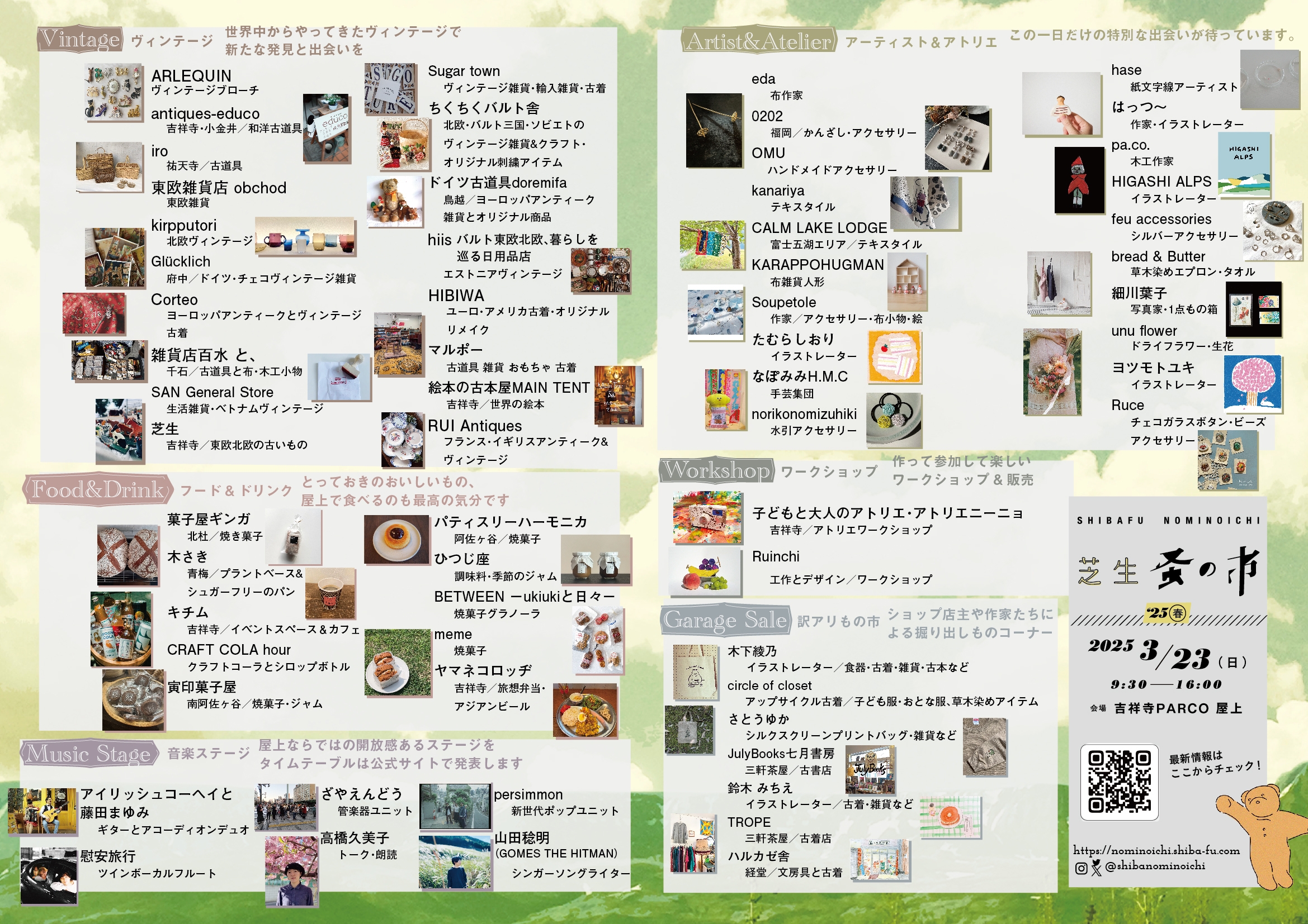 第3回となる芝生蚤の市(企画運営:有限会社ユーリアンドデザイン GALLERY SHIBAFU)を3月23日(日)に開催いたします。今回は吉祥寺PARCOの屋上に吉祥寺にゆかりのある出店者を中心に60組以上のショップ、アーティストたちが集います。