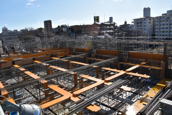 隣接するクラブハウス棟は、天白キャンパスにある8号館に入るクラブ・サークルの部室や音楽練習場を移転させる計画で、地上5階建て、延床面積 3,850㎡です。工事はこのクラブハウス棟が先行しており、4階までのコンクリート壁が完成。こちらも計画通り進行しています。