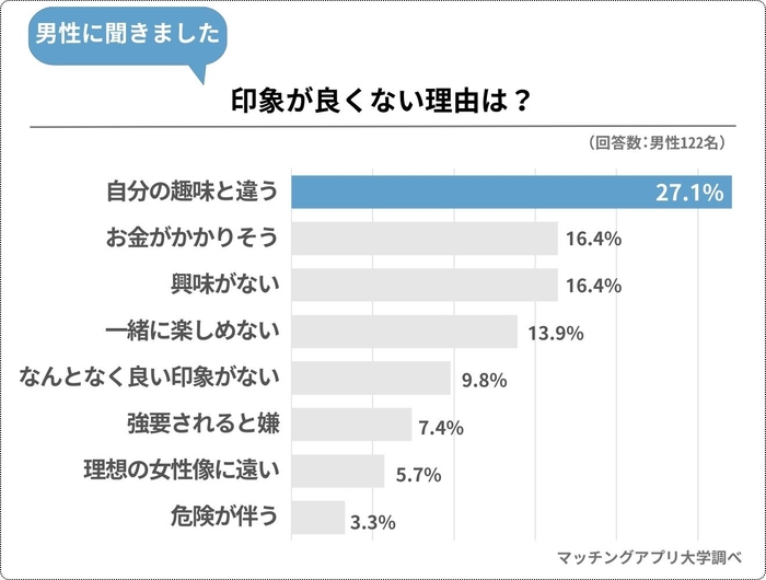 今回アンケートに答えていただいた男性122人に、女性が登録している趣味で「マイナスの印象を持つもの」についても聞いてみました。