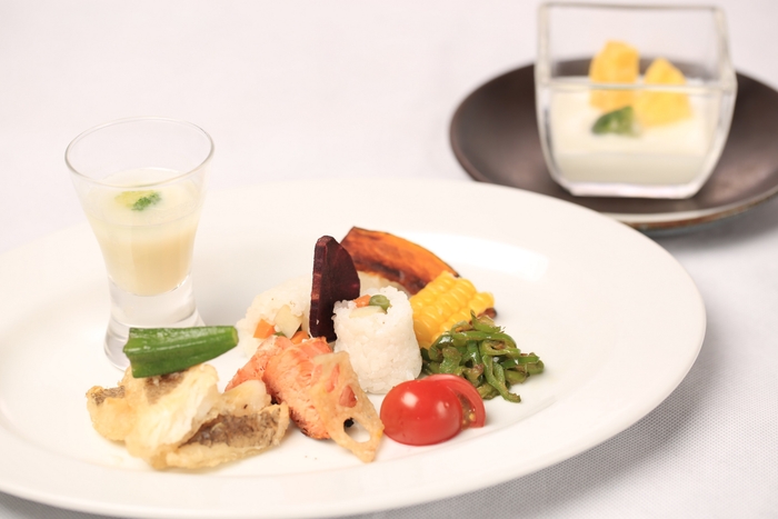 (じゃが芋のとろみ餡・ライスロール・大根・とうもろこし・れんこんチップ・唐芋チップ・おくら・鶏ささみ)