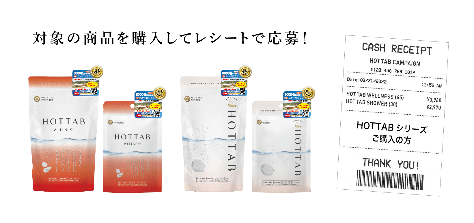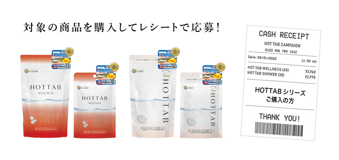 多くの美容家やトップアスリートに支持される重炭酸入浴剤の開発・販売を手掛ける株式会社ホットアルバム炭酸泉タブレット(本社:東京都八王子市、代表取締役:小星重治)は、店頭で重炭酸入浴剤「HOT TAB」をご購入いただき、ご応募くださった方の中から抽選で3,000名様以上にプレゼントが当たるキャンペーンを実施します。