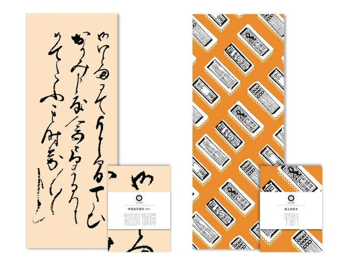 「漢土加留多(かんどかるた)」(右)と「伊達政宗書状」をモチーフにした手ぬぐいです。「漢土加留多」は、仙台藩士で海防論者の林子平が長崎で手に入れたもので、麻雀の前身と言われる中国のカードゲーム「馬吊カルタ」の絵柄によく似ています。