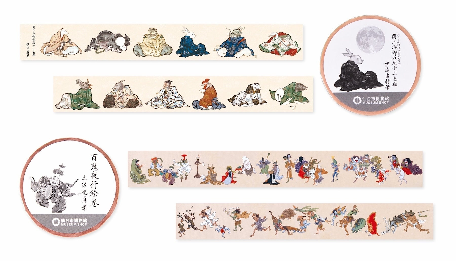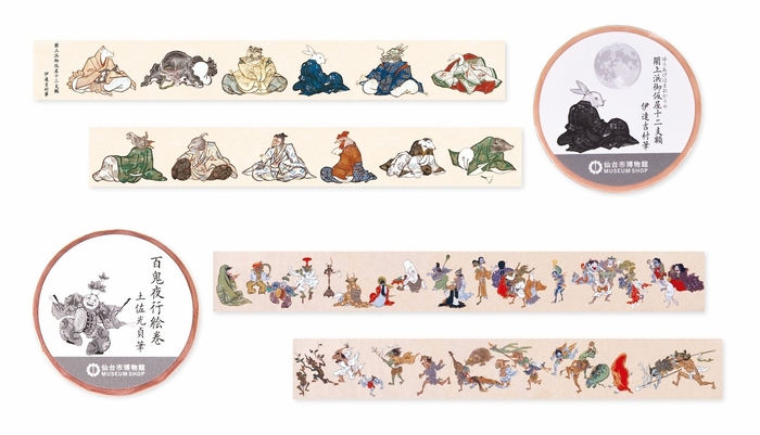 「百鬼夜行絵巻 土佐光貞筆」と「閖上浜御仮屋十二支額 伊達吉村筆」の2種に描かれたモチーフを並べたマスキングテープです。「百鬼夜行絵巻 土佐光貞筆」は、古い器物が姿を変えた妖怪(付喪神(つくもがみ))が、ある夜一斉に都の大路を練り歩くといわれる「百鬼夜行」を描いた図巻。楽器を鳴らして楽しく踊る妖怪も描かれています。「閖上浜御仮屋十二支額 伊達吉村筆」には、仙台藩5代藩主・伊達吉村が描いた絵馬で、擬人化された動物が描かれています。