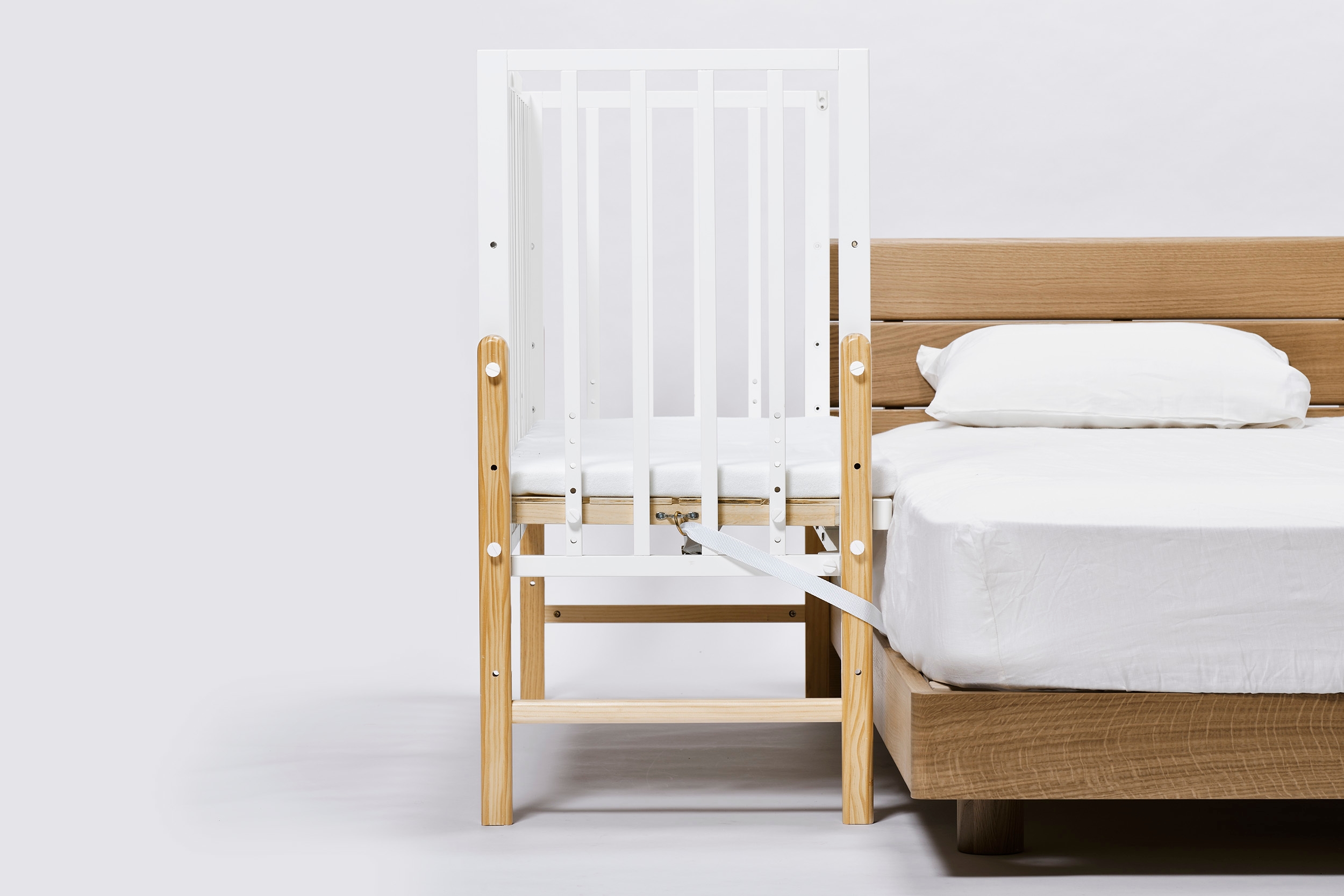 付属のサポートベルトで大人のベッドとしっかり固定でき、大人のベッドにつけたままでも、開閉扉の付け外しが可能。就寝時や離れる時も安心です。また、端が可動式になった専用マットレスが付属しているので、開閉扉を外した時にすき間を無くすことができます。