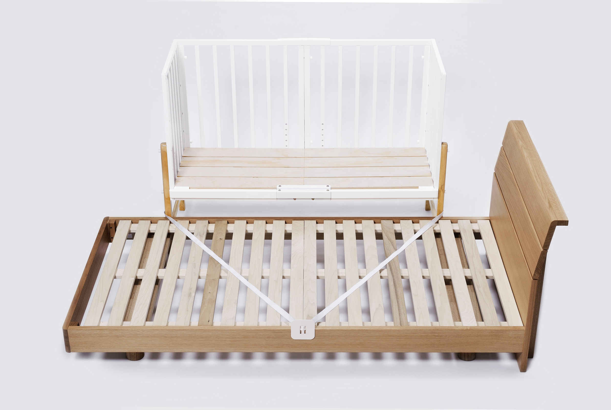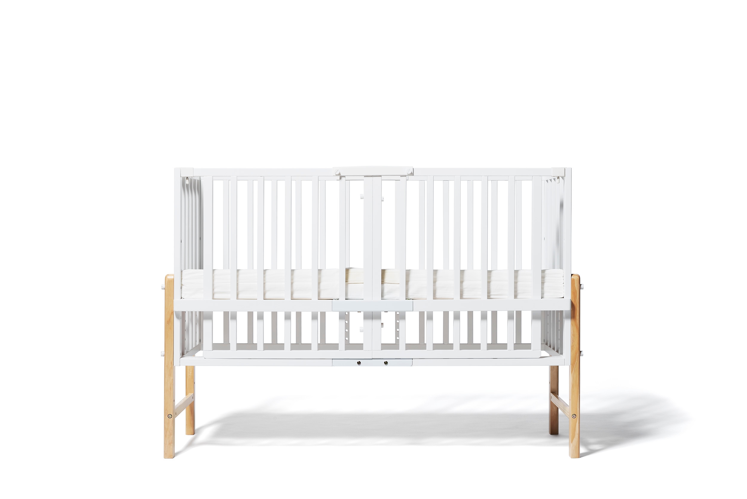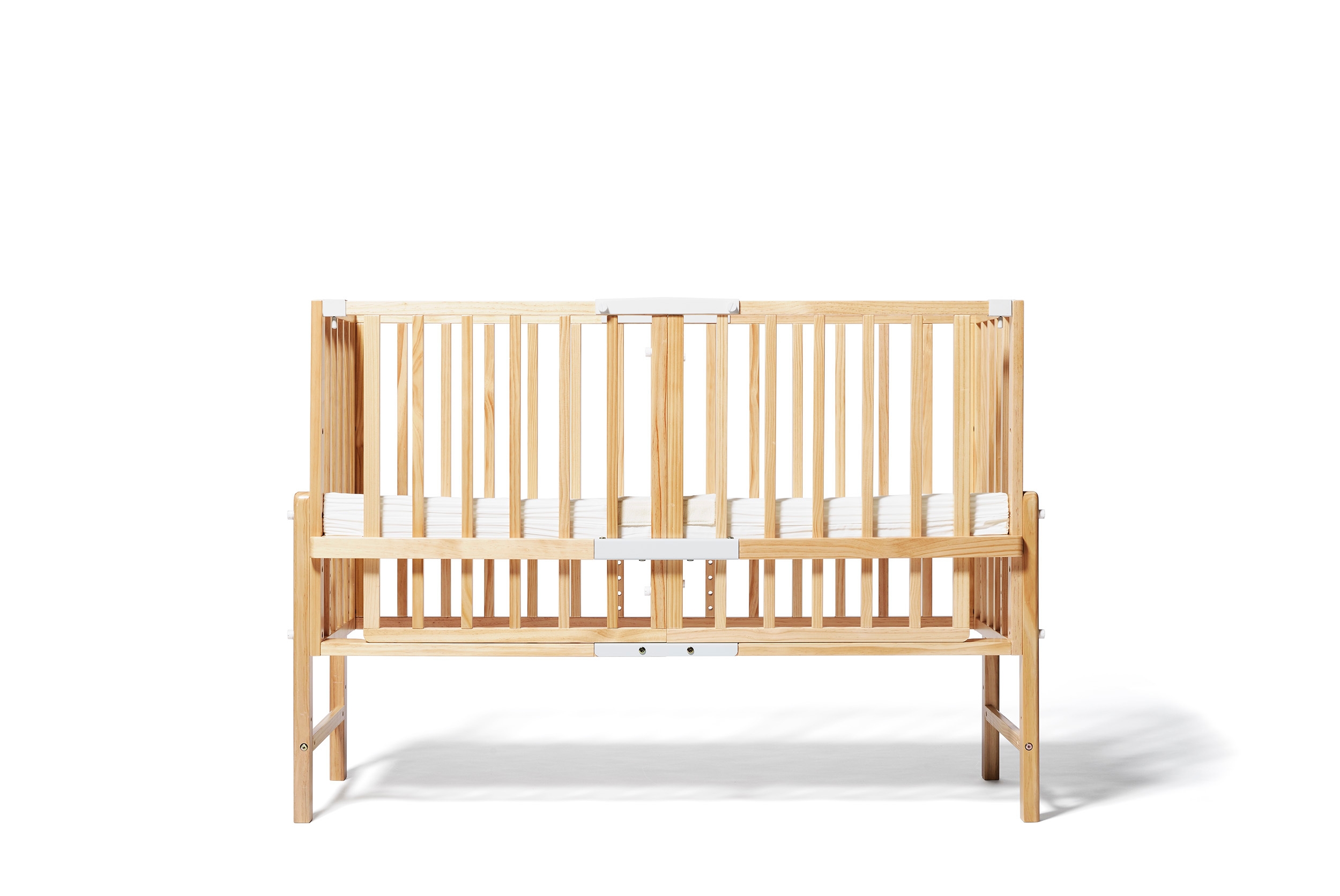 赤ちゃんが寝る床板の高さは、最上段70cmから最下段12cmまで、約3cm刻みで21段階調整が可能。ベッドにも布団にも高さを合わせてつなげて使うことができます。