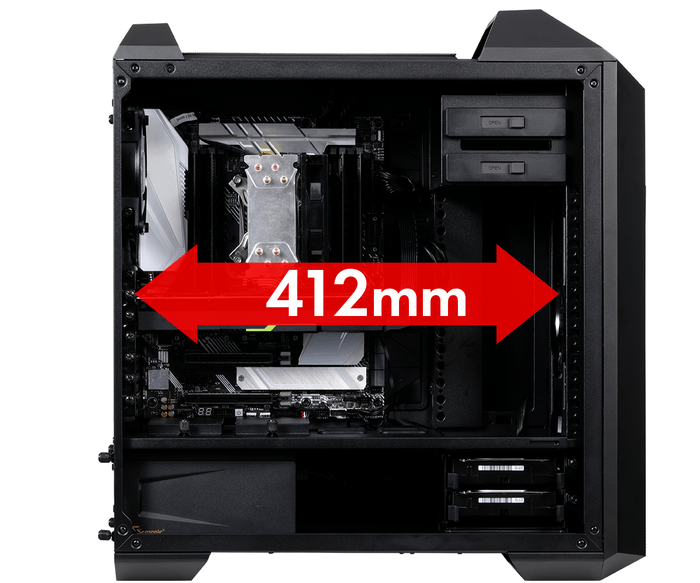 フロントには最大280mm、天面には最大360mmの水冷ラジエータを搭載可能で、グラフィックカードは最大412mmまでのものを搭載することができます。