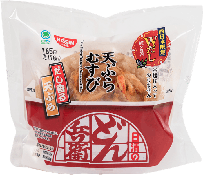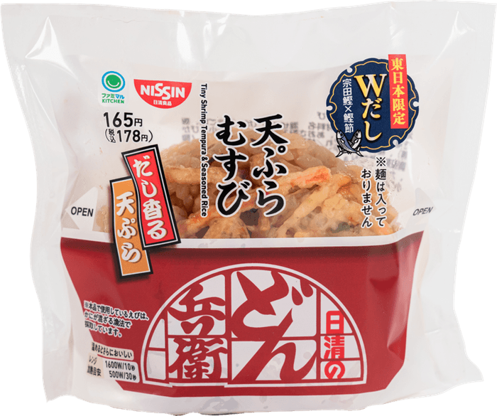 【内容】日清食品が展開する人気和風カップ麺「日清のどん兵衛」とのコラボレーション商品です。どん兵衛こだわりのだしが香るごはんに、玉ねぎの甘みと小エビの風味がポイントの天ぷらをトッピング。どん兵衛さながらの旨みを味わえます。地域ごとに味わいを変えており、東日本は宗田鰹と鰹節のWだしでコクと旨みを感じる仕立て。西日本は鰹と昆布のWだしで上品なだしの旨みが後引く味わいになっています。