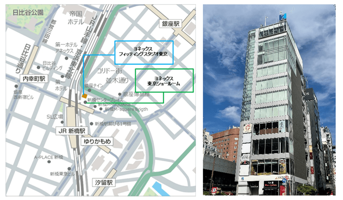 場所はJR新橋駅徒歩2分、東京メトロ銀座線新橋駅徒歩1分、隣ビルにはバドミントン、テニス、スノーボードなど弊社全種目を取り扱う情報発信拠点「ヨネックス東京ショールーム」があり、弊社製品をまとめてじっくりお試し、ご購入いただくこともできます。